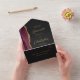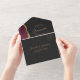 The left-hand edge of this elegant modern all-in-one wedding invitation and RSVP features a burgundy red watercolor agate border trimmed with faux gold glitter. The customisable text combines gold-coloured stylish calligraphy script and sans serif fonts on a slate black background. The return address appears on the outside flap and the reverse side of the detachable RSVP card in gold-coloured text on solid slate black.
