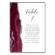 The left-hand edge of this elegant modern wedding table number card features a burgundy red watercolor agate border trimmed with faux silver glitter. The word "table" appears in charcoal grey handwriting script on a white background. Add the names of your guests who are assigned to each table.
