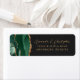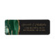 The left-hand edge of this elegant modern wedding invitation return address label features an emerald green watercolor agate border trimmed with faux gold glitter. The customisable text combines gold-coloured handwriting and sans serif fonts on a dark off-black background.