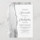 The left-hand edge of this elegant modern wedding invitation features a grey and white watercolor agate border trimmed with faux silver glitter. The customisable text combines script and sans serif fonts in charcoal grey on a white background. The reverse side features a matching grey and silver agate design.