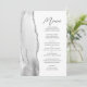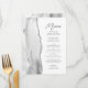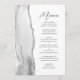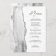 This elegant modern wedding menu features a grey and white watercolor agate border trimmed with faux silver glitter. The customisable text combines charcoal grey handwriting script and sans serif fonts on a white background. The agate design is repeated on the reverse side.