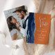 This elegant modern save the date card features a navy blue watercolor agate border trimmed with faux silver glitter. The customisable text is light silver grey on a burnt orange background. Easily replace the sample image on the reverse side with a vertical photo of the future bride and groom.