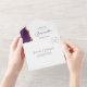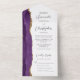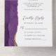 The left-hand edge of this elegant modern all-in-one wedding invitation and RSVP features a purple watercolor agate border trimmed with faux gold glitter. The customisable text combines stylish charcoal grey calligraphy script and sans serif fonts on a white background. The return address appears on the outside flap and the reverse side of the detachable RSVP card in gold-coloured text on solid white.