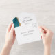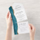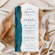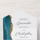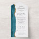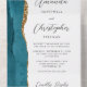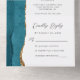 The left-hand edge of this elegant modern all-in-one wedding invitation and RSVP features a teal blue watercolor agate border trimmed with faux gold glitter. The customisable text combines stylish charcoal grey calligraphy script and sans serif fonts on a white background. The return address appears on the outside flap and the reverse side of the detachable RSVP card in gold-coloured text on solid white.