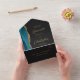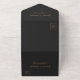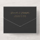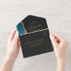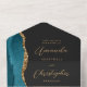 The left-hand edge of this elegant modern all-in-one wedding invitation and RSVP features a teal blue watercolor agate border trimmed with faux gold glitter. The customisable text combines gold-coloured stylish calligraphy script and sans serif fonts on a slate black background. The return address appears on the outside flap and the reverse side of the detachable RSVP card in gold-coloured text on solid slate black.