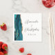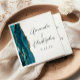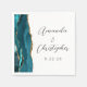 These elegant modern wedding napkins feature a teal blue watercolor design trimmed with faux gold glitter. Easily customise the charcoal grey text on a white background, with the couple's names in stylish handwriting calligraphy and the date in sans serif font.