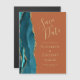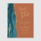 This elegant modern save the date magnet card features a teal blue watercolor agate border trimmed with faux gold glitter. Easily customise the gold-coloured text on a burnt orange or rust background.