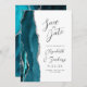 The left-hand edge of this elegant modern wedding save the date card features a teal blue watercolor agate border trimmed with silver faux glitter. The customisable text combines charcoal grey handwriting, copperplate and italic fonts on a white background. The reverse side features a matching teal and silver agate design.