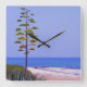 This photo was taken in the tropics along the seashore. Brown and white sand leads up to the ocean. The dunes show grass with an Agave tree. A blue sky with no clouds are seen in the photo. This design is available on a square or round clock.