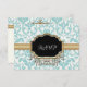 RSVP: Use this size for Square or long (4 x 9 1/4") invitations. The larger size will NOT fit. NOTE: This is a flat printed invitation, there are no raised layers or actual metal or jewels in it. This is a graphically designed image that looks quite real, but is flat. If you are DIY handy, you could easily add real jewels to this design. COLOR PALETTE: off white, aqua blue, black and gold metallic look. DESIGN COLLECTION: This is a truly elegant and sophisticated Wedding Invitation Collection with a formal modern vintage flair! Shown here in creamy white on aqua blue, the invitation has an elegant dramatic dimensional appearance. For a beautiful finishing touch select the matching invitation envelope of the same design. This is artwork designed by Audrey Jeanne Roberts created from antique vintage look worn damask patterns, a beautiful frame with diamond look "jewels" dangling from it and layered over a gold look ribbon. There are RSVP response cards, Reception Invitations, Wedding Program, Driving instructions, Hotel Accommodation cards, postage, stickers and more available to match. If there's a product you would like to have created that isn't offered just message us!