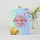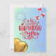 Front: The card has a light blue background. In the centre, there is a large red text that reads “Happy Birthday to You,” decorated with white and red stars. Above the text, there are two white fireworks, and scattered around are small stars. To the right, there are two gift boxes with red ribbons, and in the bottom left corner, there is a golden heart-shaped balloon.