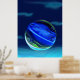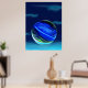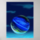 Is this where marbles come from? An abstract sphere, resembling blown glass, floating over a pale turquoise cloud. Predominant colors are blue, turquoise and aquamarine.