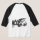 A close-up of a white baseball tee shirt with a bold graphic design.