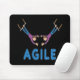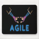 Agile design shows trapeze artists over the word Agile creating a fun graphic for agile gurus, scrum masters and project teams.