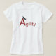 A black Lab scales the A-frame in the word Agility showing she is already having fun! Share the enthusiasm your Labrador has for running dog agility by sporting this special t-shirt. Agility Dog original design by Amy Reges.