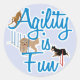 A doberman jumping, a Beardie weaving, a boxer in contact position .... these cartoon style dog are having fun in agility. Agility is fun and this coloful cheerful design reflects that fun. Choose your apparel type or change a background colour on a button. You can personalise this design to make it especially you.