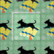 Black shadow silhouette of a dog with ears and a tail flying leaps a long jump. The background is green with a scattering of paw prints.