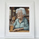 Bar art. An old lady drinking a beer and shot at a bar. Funny tavern saloon humour art.