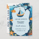 This is a baby shower post card with a nautical and under-the-sea theme. The design features a sailboat, playful sea creatures like fish and a dolphin, and a blue ocean background, creating a charming and whimsical atmosphere. The central text, "Ahoy Boy," suggests a fun maritime theme, perfect for celebrating the arrival of a baby boy.