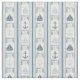 This pattern fabric features the slogan "Ahoy it's a boy" along with nautical graphics like sailboats and anchors and vertical stripes in shades of blue against a cream coloured background.