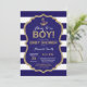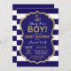 Ahoy it's a Boy! Nautical Baby Shower Invitation. Navy Blue and Gold Glitter. Navy Stripes background. For further customisation, please click the "Customise it" button and use our design tool to modify this template.