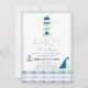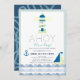 This cute and modern "Ahoy, It's a Boy" baby shower invitation features a lighthouse in light tuiquoise blue and navy blue, sailboat, anchor with blue waves on a white background framed by a light turquoise blue border. The reverse side features a navy blue background with navy blue rope patterns. Personalise for your needs. You can find more matching products at my store.