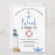 This is a nautical themed birthday invitation. Watercolor nautical elements - sailboat (paper boat), lighthouse, anchor, nautical knots on buoy.