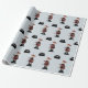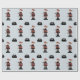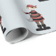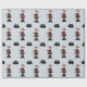 Fun pirate wrapping paper is certain to be your little one's favourite birthday package! Pirate is wearing red and black striped shirt, brown pants, pirate boots and a red bandanna. His knife is at his side through his belt. In between the pattern of pirates are pirate hats with crossbones on them. Background is a pale blue.
