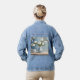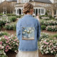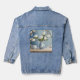 This stylish denim jacket features a pretty magnolia flowers design created with artificial intelligence art. The art features white magnolia flowers in a light blue urn. There are more magnolia flowers on the wallpaper. The flowers are on a light blue background. The white magnolia AI Art image looks very artistic. The pretty floral design is on the back of the jacket. You can pay for this denim jacket with 4 interest-free payments with Klarna.