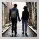 A couple in love walking down an urban alley holding hands. City vibe artwork. Could also kinda feel like Paris or London.