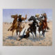 This is a wonderful image by famous cowboy artist Frederic Remington, called Aiding A Comrade. It depicts two mounted cowboys coming to the aid of a third cowboy caught up in the stirrup of his bucking bronco. This is a scene that played out many times in the old American West. Remington was a master at capturing the action of this historic time. This is one of his more famous paintings, and the image is now in the public domain for all to enjoy.