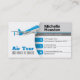 A modern business cards with flying blue airplain. Perfect for travel agency, tourism firm, pilots and flight schools or tour guides. Easy to customise with your information.