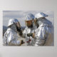 Aircraft Rescue Firefighter Marines look over each other�s bunker suits featured with safety.