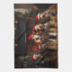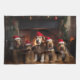 An enchanting scene captures the essence of cosiness and holiday spirit as furry companions adorned in Santa Claus hats gather around a crackling fireplace. The warmth emanating from the hearth creates a snug atmosphere for these adorable canines, while festive stockings hang in the background, enhancing the merry ambiance. The charming illustration portrays a timeless image of companionship and festive joy, perfect for celebrating the holiday season with a touch of canine charm.