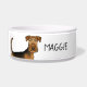 Destei's original cartoon illustration of a cute Airedale Terrier breed dog. Next to the dog there is also a personalizable text area for a name or other custom text such as "Water" or "Food".