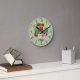 Destei's original cartoon illustration of an adorable Airedale Terrier breed dog's head close-up surrounded by colourful summer wildflowers. There is a blush pink flower, a purple flower, a dark pink flower and a white daisy flower together with some green leaves and branches. The background colour is green with a light polka dot pattern. The background colour can be changed to any other colour and the polka dot pattern can be removed, if so wished. The hours are marked with numbers. The hours and minutes are shown with a dotted clock face. There is also a personalizable text area for a name or other custom text in a lovely script font.