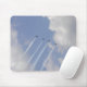 A squadron of military jets performs their manoeuvres among the cumulus clouds above a summer air show.