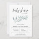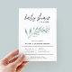 This baby shower invitation design features modern minimalist typography adorned with a simple gender neutral stem of pale blue green leaves. Use the design tools to add your baby shower party details or customise to suit your event.