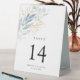 Airy Greenery and Gold Leaf table tent sign featuring elegant bouquet of Dusty blue, Navy, slate rose flowers buds and blue eucalyptus leaves. Please contact me for any help in customisation or if you need any other product with this design.