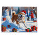 A heartwarming holiday illustration featuring a cheerful dog playing in the snow, wearing a Santa hat and surrounded by colourful gift boxes. In the background, children build a snowman beside a snow-covered Christmas tree, creating a joyful winter wonderland. Perfect for spreading holiday cheer and capturing the magic of Christmas.