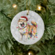 On the front of this Holiday ornament is an image of a cute Akita dog wearing a Santa hat and wrapped in coloured Christmas lights. The image is set against a festive silver bokeh background. The back of the ornament has the same background with your custom text in red and green. Cute for anyone, but especially for kids from a parent or grandparent.