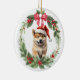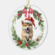 This pretty Holiday ornament features a portrait of an adorable Akita puppy dog. The puppy is framed with a holly and red berries wreath, with a bright red bow at the top. The back of the ornament has the same red bow wreath, with two text fields for you to customise.