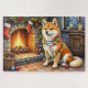 Akita Sitting by Fireplace with Christmas Lights Jigsaw Puzzle
