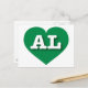 This postcard features an eco-friendly vibrant green heart containing the bold, white, upper case letters AL, the official abbreviation for Alabama, the yellowhammer state. The reverse side of the postcard is blank, awaiting your customised text or handwritten sentiments. Roll Tide!