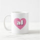 This mug features two pink hearts containing the bold, white, rounded, lower case letters al, a playful abbreviation for Alabama, the yellowhammer state. Roll tide!