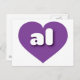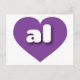 This postcard features a vibrant purple heart containing the bold, white, rounded, lower case letters al, a playful abbreviation for Alabama, the yellowhammer state. The reverse side of the card is blank, awaiting your customised text or handwritten sentiments. Roll tide!