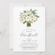 Elegant floral baby shower invitations feature a bouquet of watercolor white roses and peonies with lush green botanical foliage and leaves. Personalise with your baby shower details beneath in a chic mix of block, serif and calligraphy typefaces.
