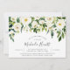 Chic floral baby shower invitation features a top border of ivory roses and white peonies with lush botanical foliage and greenery. Personalise with your baby shower details in modern hand lettered script and traditional sans serif lettering. Invitations reverse to rich jewel toned jasper green.