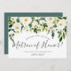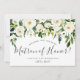 Chic floral bridal party proposal card features a top border of ivory roses and white peonies with lush botanical foliage and greenery. Personalise with your matron of honour request details (shown with "will you be my matron of honour? I can't say I do without you") in modern hand lettered script and traditional sans serif lettering. Invitations reverse to rich jewel toned jasper green.