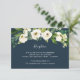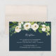 Designed to coordinate with our Alabaster wedding collection, this fresh green and navy blue botanical reception enclosure card features a spray of watercolor greenery and white florals topping your wedding reception details, venue and timing.